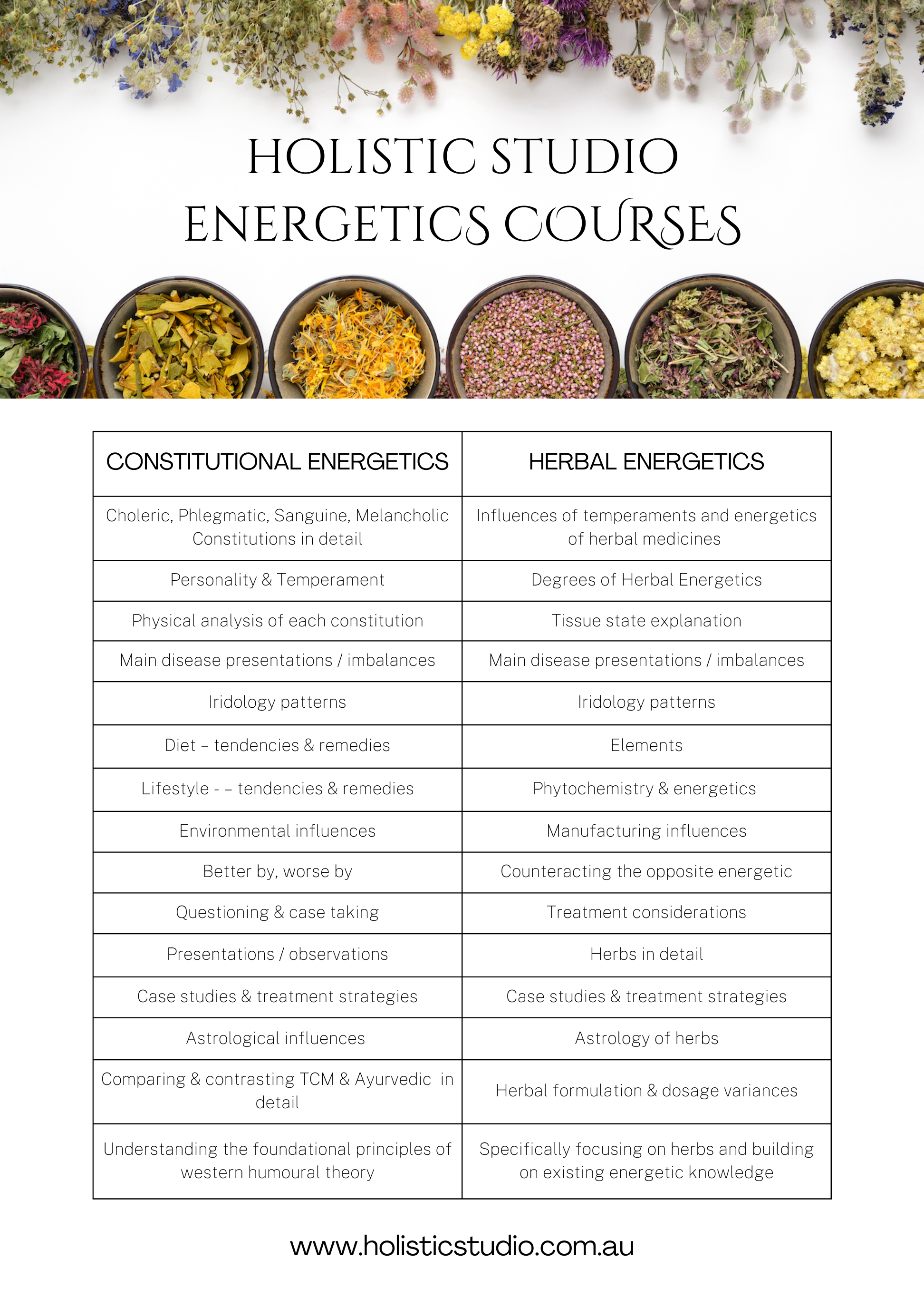 The Constitutional Energetics Course (suitable for all modalities) covers the Western humors, TCM and Ayurvedic energetics with a focus on diet, lifestyle and personality in great detail. It is a good foundational course for those who want to really understand energetic approaches. The Herbal Energetics Course (suitable for herbalists and naturopaths) requires a foundational understanding of energetics and Western humours as it focuses more on tissue states, degrees and the herbs themselves.